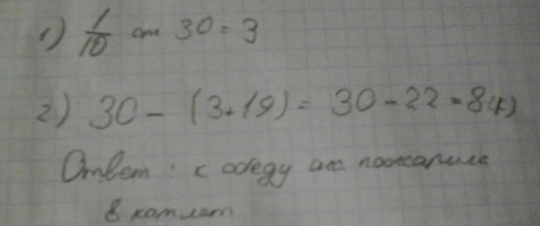 купили 30 котлет .После того как бабушка пожарила к завтраку десятую часть и несколько котлет к обеду у нее осталось 19 котлет.сколько котлет бабушка пожарила к обеду