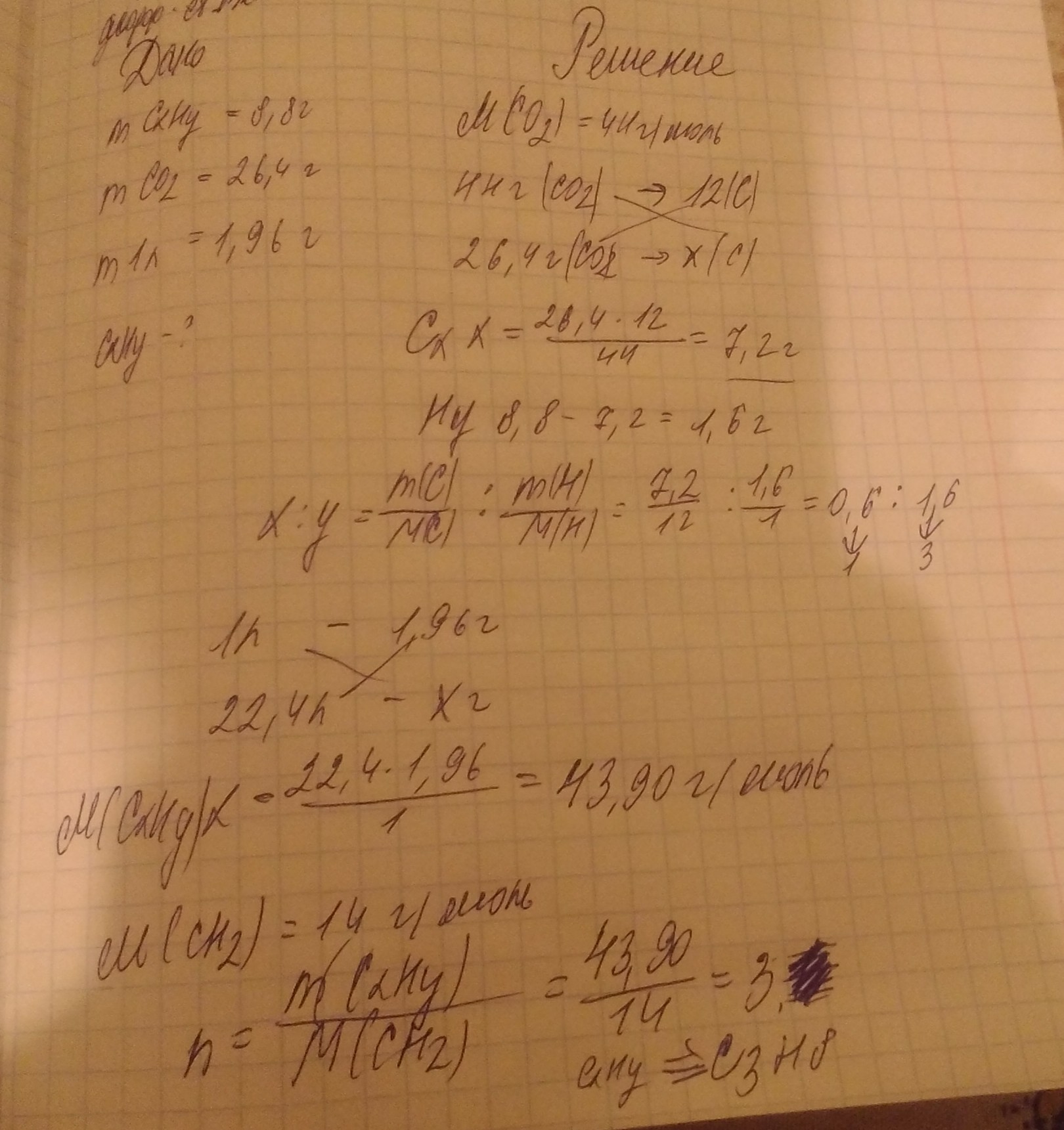 Установите формулу углеводорода , если при сжигании 8,8 г его(углеводорода) образовалось 26,4 г СО2. Масса 1 литра вещества н.у 1.96 г. Ответ: С3Н8