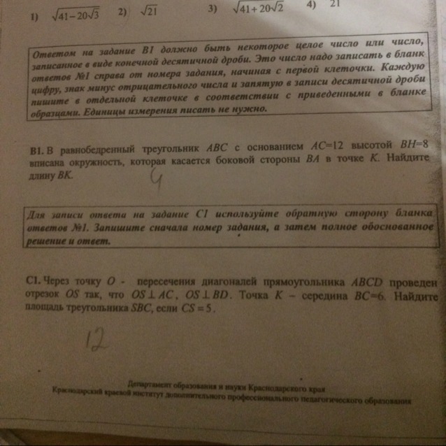 4) ▲ОВК - прямоугольный, так как радиус в точке касания К перпендикулярен касательной, то есть стороне ВС.