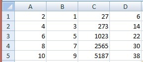 В два столбца электронной таблицы введите 5 четных и 5 нечетных чисел (соответственно 1 и 2 столбец), в третьем столбце просчитайте посредством формул утроенную сумму их кубов, в четвертом – удвоенную разность квадратов.