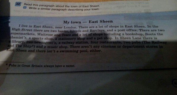 Я живу в Ист Шин, который рядом с Лондоном. Там есть много магазинов. На Хай Стрит есть 2 банка, регистр Ллойда и Барклэйс, и почтовый офис. Там есть 2 супермаркета, Уэйтроз и Теско и много магазинов, включая книжный, аптека, спортивный магазин, канцелярские товары и зоомагазин. На Шин Лэйн есть библиотека, 2 новостных ларька, железнодорожная станция, 4 ресторана, 2 бара (Железнодорожный путь и Корабль) и также музыкальный магазин. Там, в Ист Шин нет кинотеатров или универмагов, а также нет плавательного бассейна.