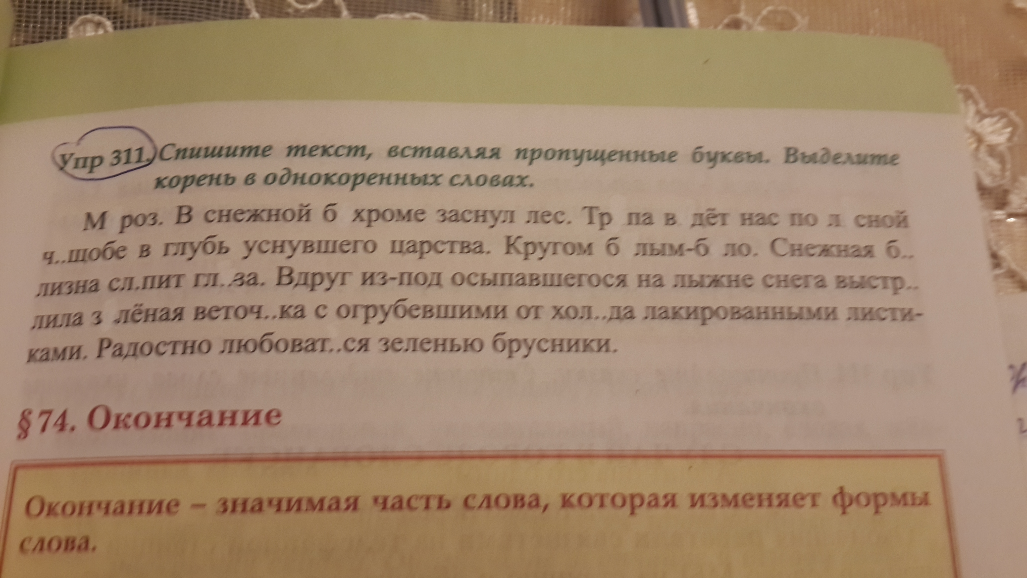 Помогите пожалуйста с заданием 311 Спишите текст вставляя пропущенные буквы Выделите корень в однокоренных словах