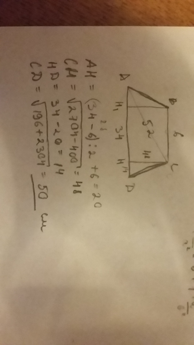 Основание равнобокой трапеции равны 6 см и 34 см а диагональ 52 см. Найдите боковую сторону трапеции, (можно пожалуйста поподробнее)