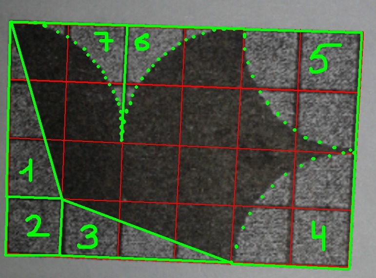 Фигуры 4 и 5 представляют собой четверти окружностей, а фигуры 6 и 7 - дополнение четверти окружности до квадрата. Таким образом общая площадь этих фигур: