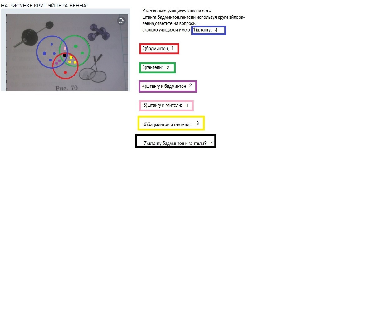 у нескольких учащихся класса есть штанга бамбинтон и гантели рисунок 70 Используйте круг велюрова на Ответьте на вопрос Сколько учащихся имеют 1 штангу 2 бамбинтон и 3 гантели
