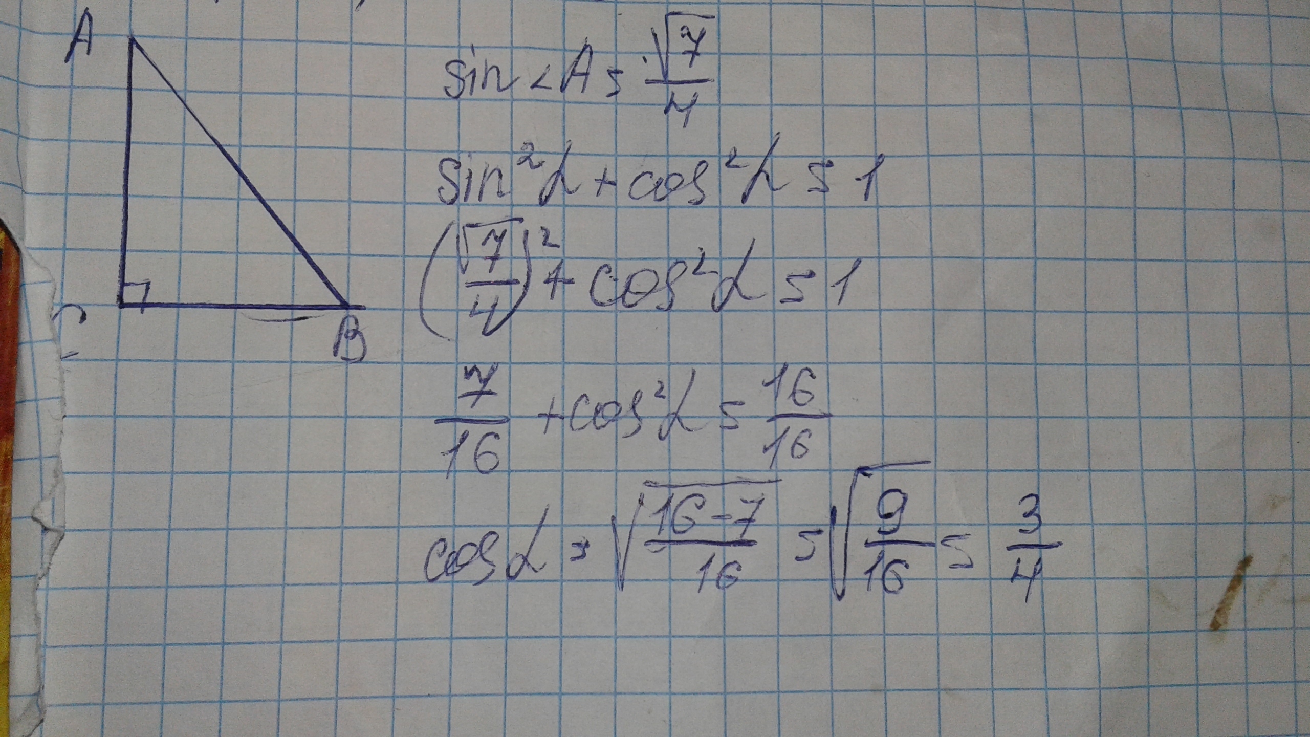треугольники а б ц угол ц равен 90 градусов Синус А равен корень из 7 делить на 4 Найдите косинус и Огромное спасибо