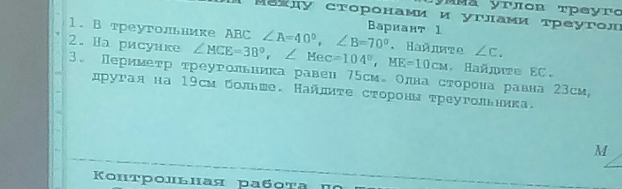 в треугольнике abc угол а = 40° ,угол b = 70° найти угол c.