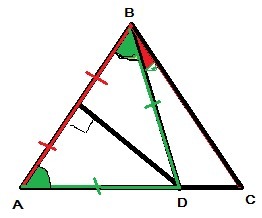 Серединный перпендикуляр в треугольнике является медианой и высотой⇒ ΔABD-равнобедренный, ∠BAC=∠ABD.