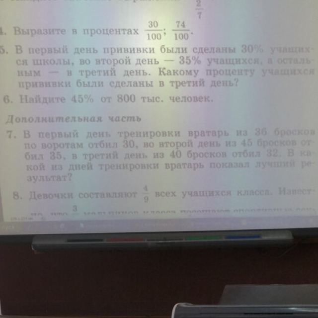 7. В первый день тренировки вратарь из 36 бросков по воротам отбил 30,т.е 30/36=5/6.Во второй день из 45 бросков отбил 35, т.е. 35/45=7/9.В третий день из 40 бросков отбил 32, т.е. 32/40=4/5.Получили три дроби, сравним их и найдем наибольшую.Общий знаменатель 90.Тогда 5/6=75/90, 7/9=70/90, 4/5=72/90. Сравним 75/90 > 72/90 > 70/90.Получаем, что лучший результат вратарь показал в первый день.