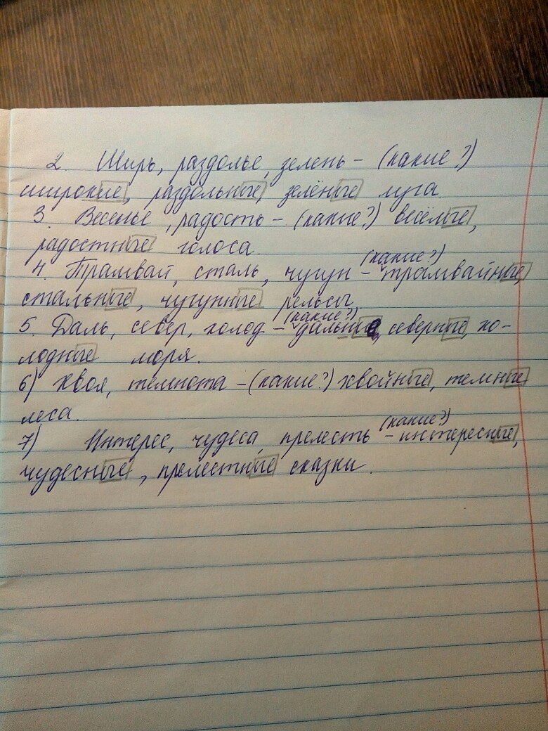 Широкие, раздольные, зеленые луга. Веселые, радостные голоса. Трамвайные, стальные, чугунные рельсы. Дальние, северные, холодные моря. Хвойные, темные леса. Интересные, чудесные, прелестные сказки.