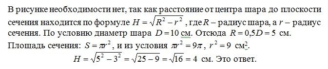 Діагональ кулі дорівнює 10 см. Знайдіть відстань від центра кулі до перерізу кулі, площа якого дорівнює 9П см2