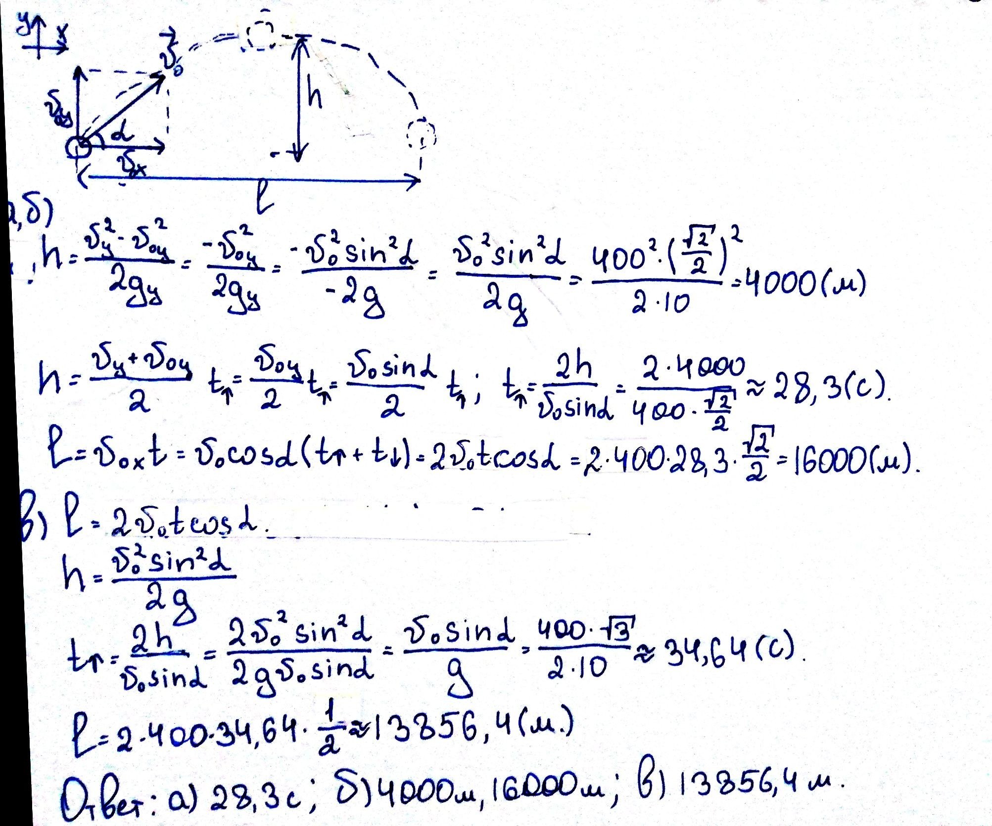 Из пушки произведен выстрел под углом 45° к горизонту. Начальная скорость снаряда 400 м/с.