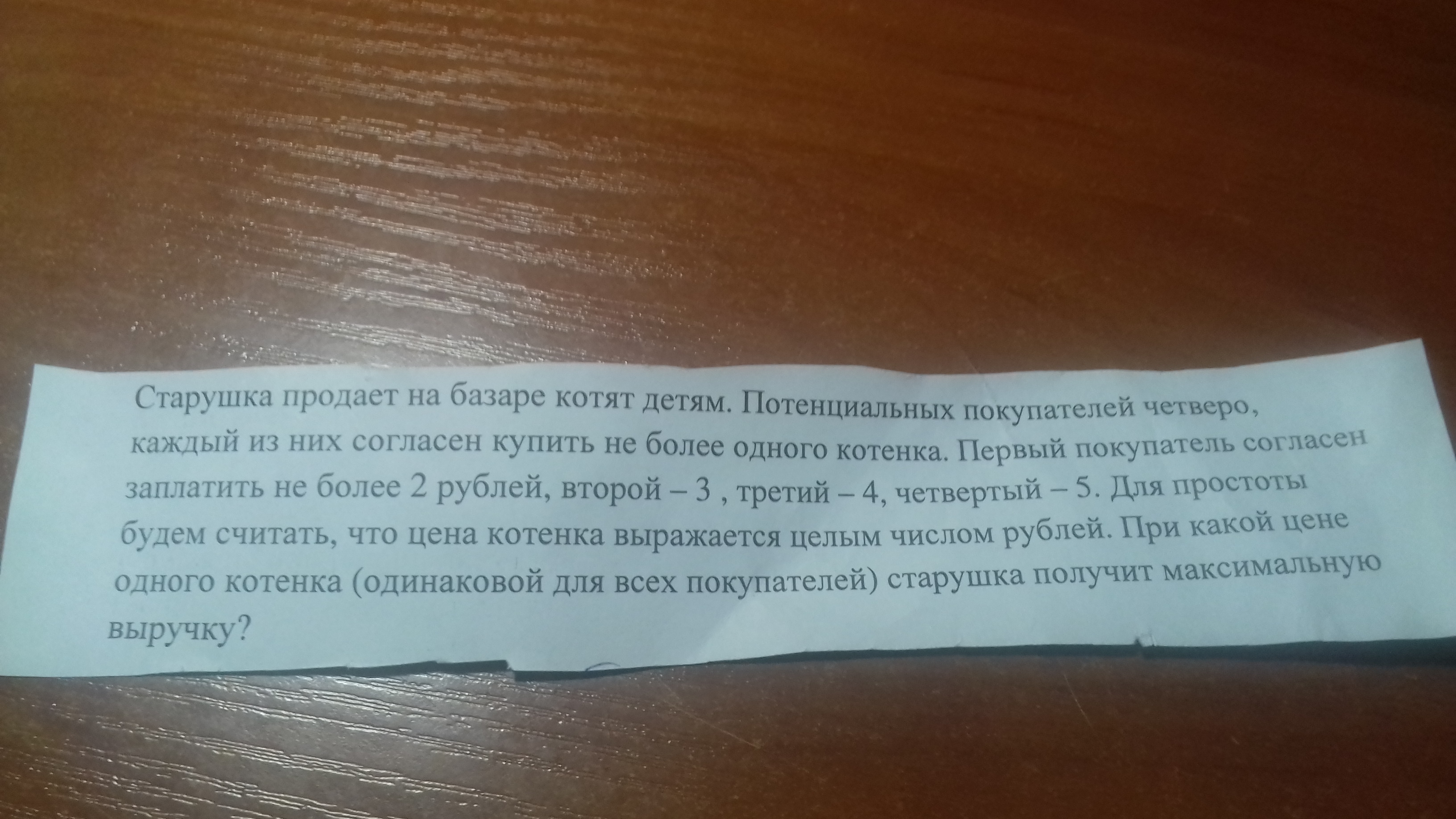 если цена котенка 2 рубля, то тогда купят котят все четыре покупателя