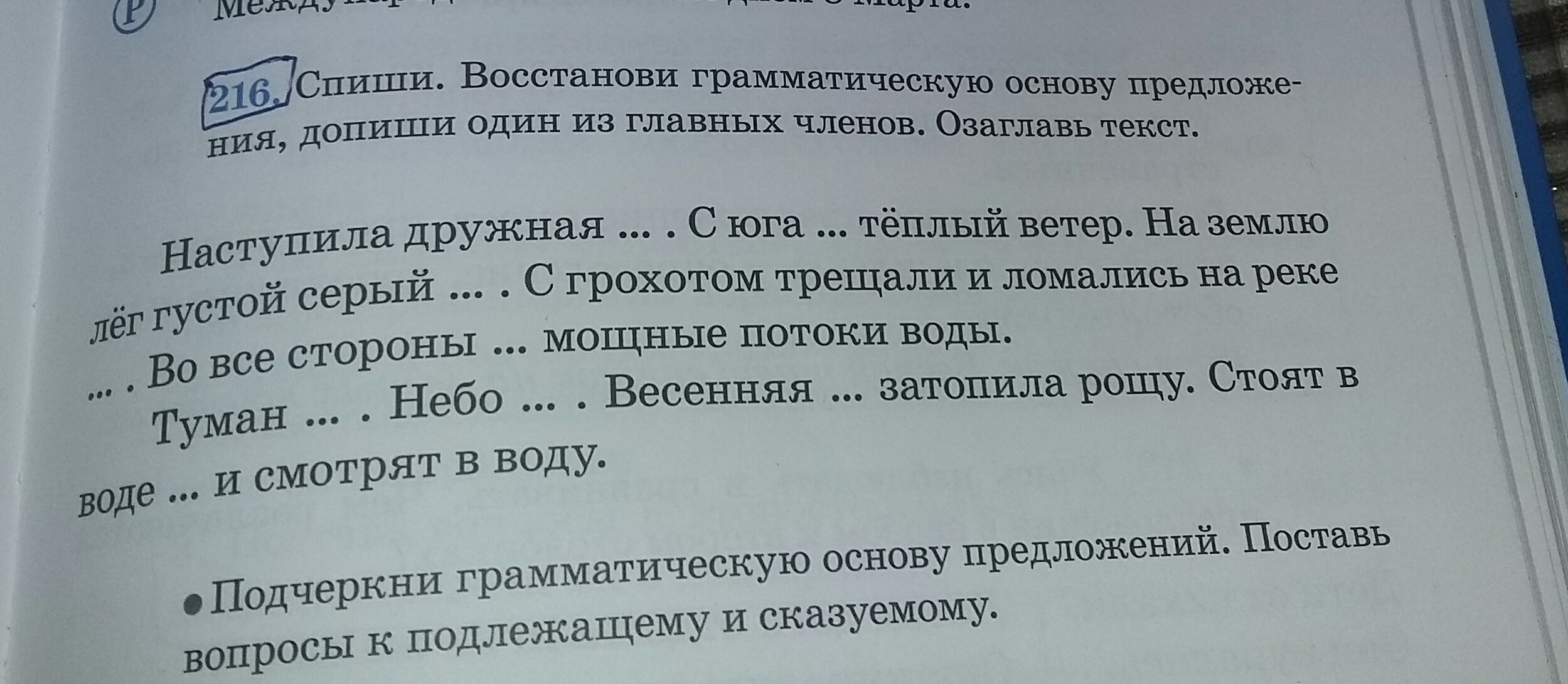 Наступила дружная весна (весна (что сделала?) наступила). С юга подул тёплый ветер (ветер (что сделал?) подул). На землю лёг густой серый туман (туман (что сделал?) лёг). С грохотом трещали и ломались на реке льдины (льдины (что делали?) трещали, ломались). Во все стороны бились мощные потоки воды (потоки (что делали? бились).
