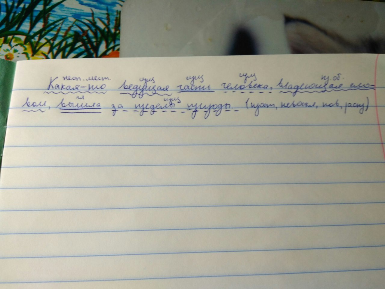 Синтаксический разбор предложения: Какая-то ведущая часть человека, владеющая словом, вышла за пределы природы. и характеристика предложения пож
