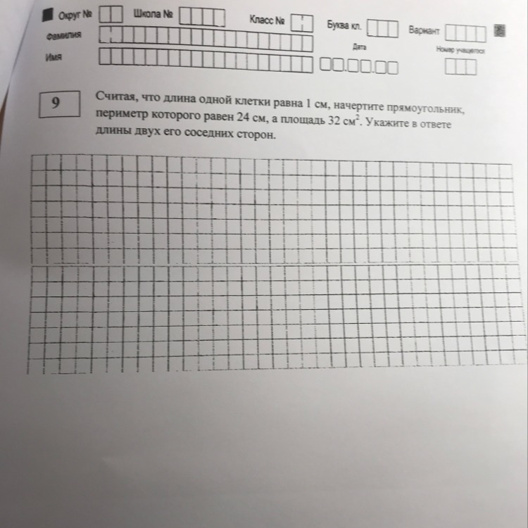 Считая,что длина одной клетки равна 1 см,начертите прямоугольник,периметр которого равен 24см,а площадь 32см2.Укажите в ответе длины двух его соседних сторон.Помогите пожалуйста!Срочно!