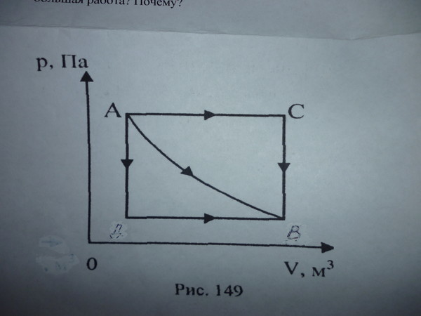 Идеальный газ переводится из состояния А в состояние B тремя способами: ACB, AB, AДB(рис. 149) В каком случаи совершается большая работа? почему?