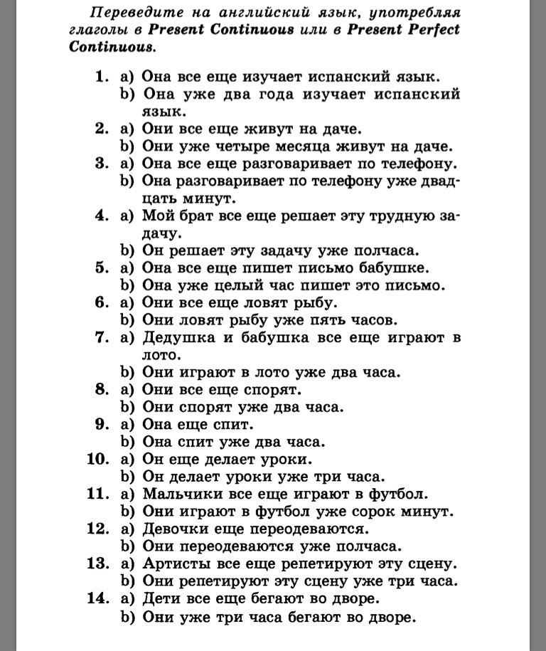 She is still studying Spanish. She has been studying Spanish for two years already. They are still living at the dacha. They have been living in the country for four months now. She's still talking on the phone. She's been on the phone for twenty minutes.My brother is still solving this difficult problem. He has been solving this problem for half an hour already.She is still writing a letter to her grandmother. She has been writing this letter for an hour now. They are still fishing.Grandparents still play in the lotto.They are still arguing.They've been arguing for two hours already. She's still asleep. She's been sleeping for two hours.He's still doing lessons. He's been doing lessons for three hours. The boys are still playing football.They play football for forty minutes. Girls are still changing clothes. They change their clothes for half an hour.Artists are still rehearsing this scene. They rehearse this scene for three hours already. Children are still running in the courtyard. They have been running in the courtyard for three hours already.