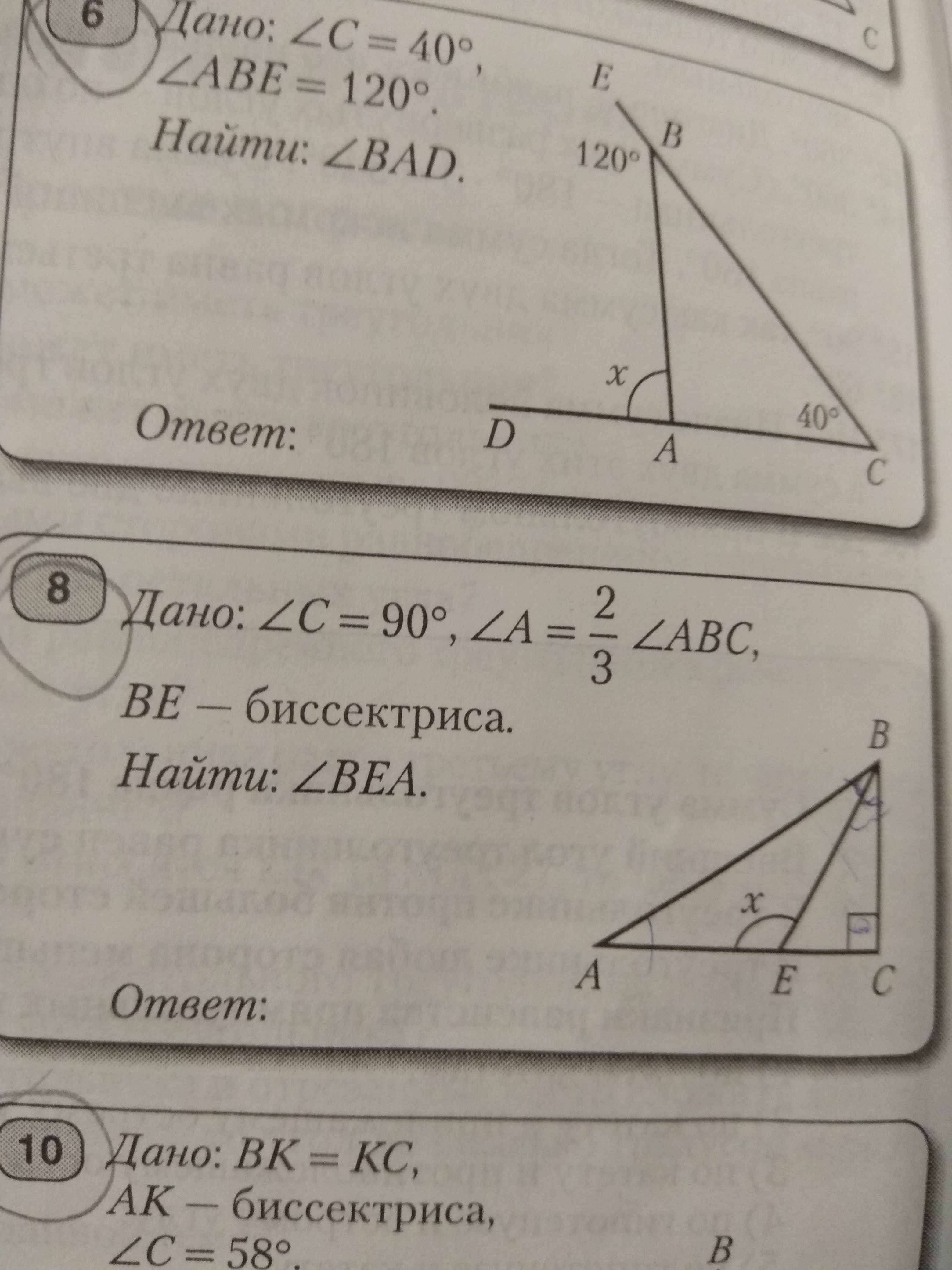 6. угол АВС равен 180-120=60 градусов. В треугольнике АВС угол А равен 180-60-40=80 градусам. Угол ВАD смежен углу ВАС и равен 180-80=100 градусам.