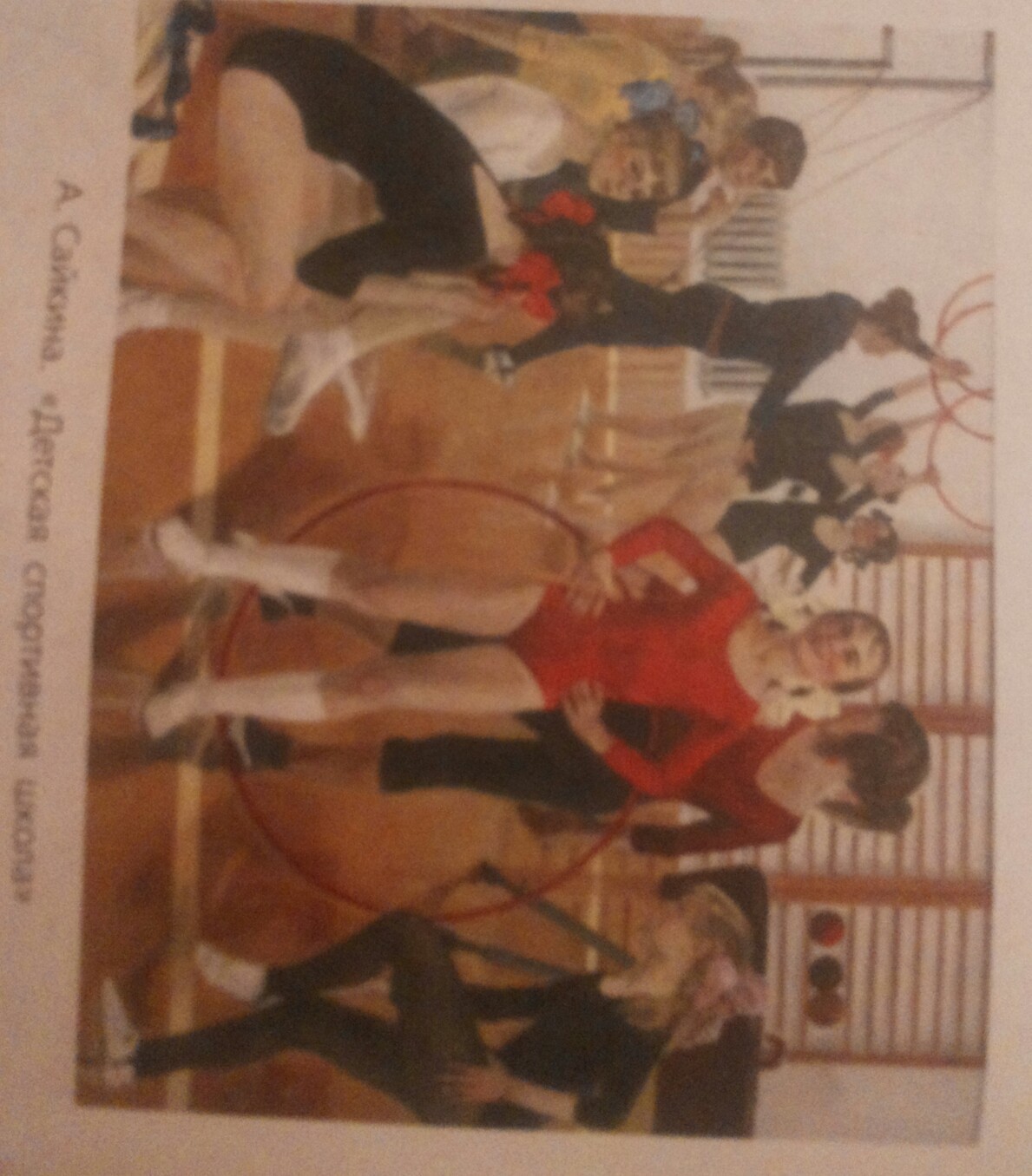 Мое внимание привлекает девушка в красном купальнике, она стоит в самом центре картины. лицо её усталое. рядом с ней стоят девочки гимнастки.