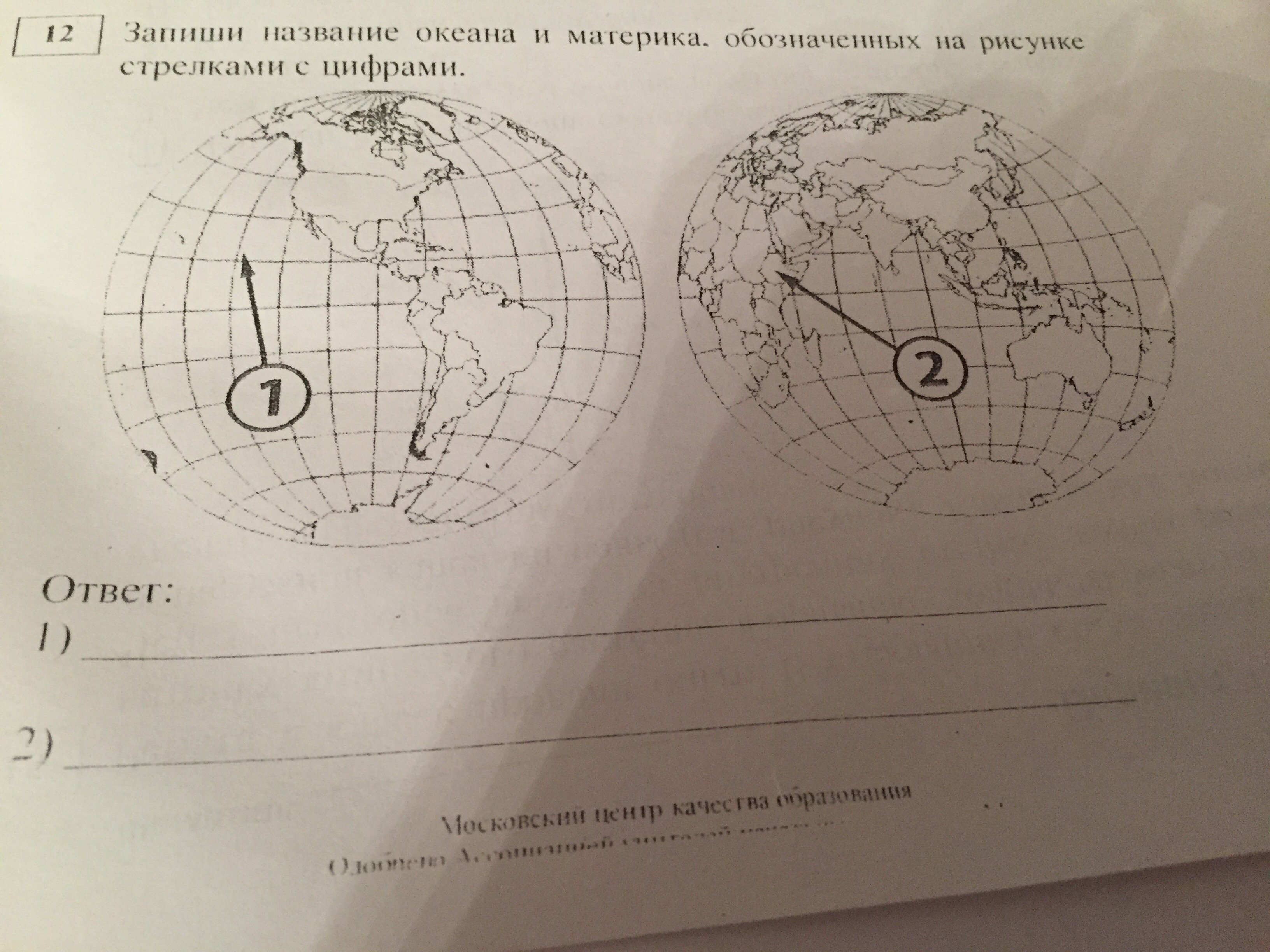 Помогите пожалуйста с заданием запиши название океана и материка обозначенных на рисунке стрелками с цифрами !