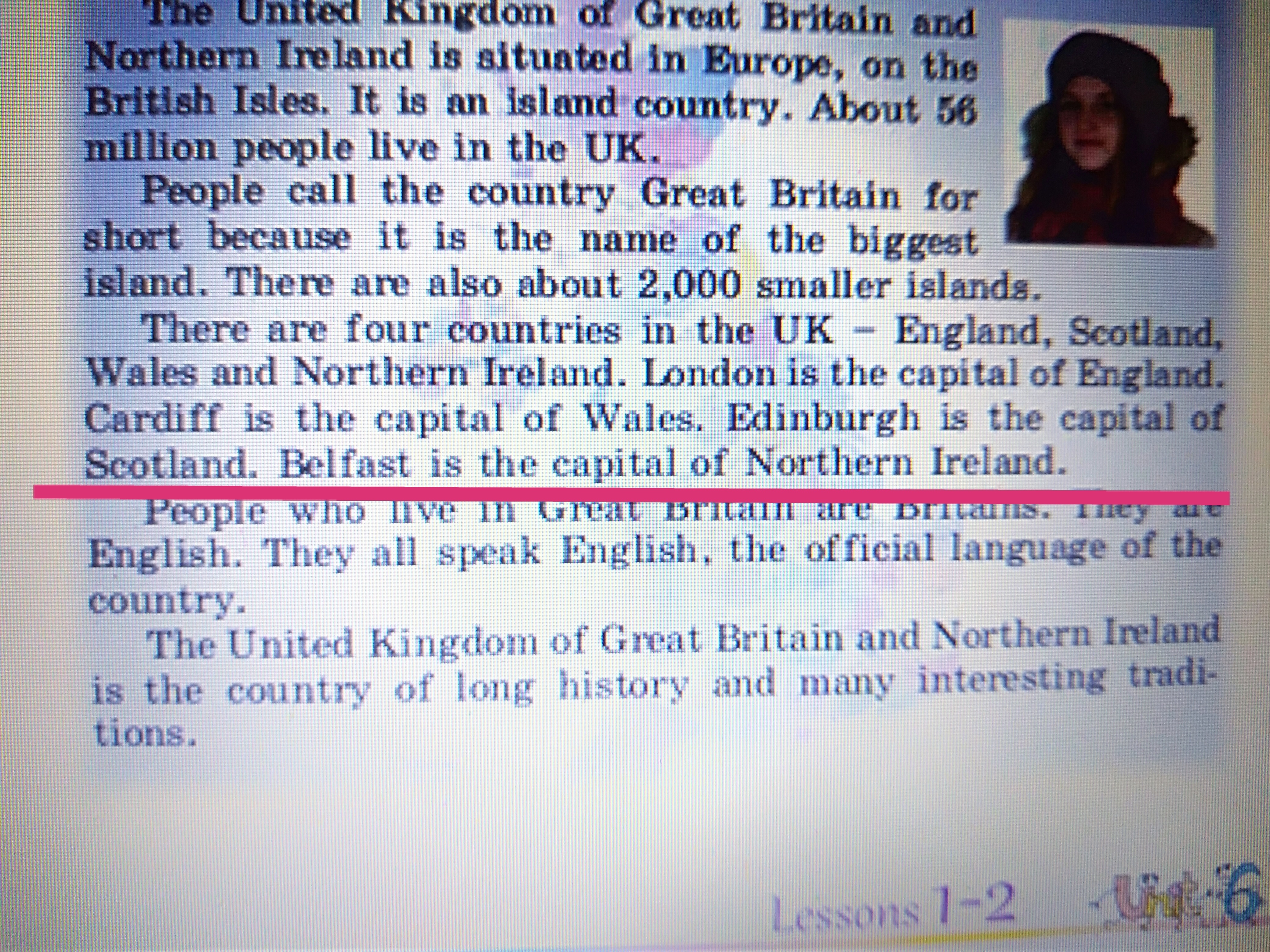 Четыре страны входят в состав UK-Англия, Шотландия, Уэльс и Северная Ирландия.Лондон столица Англии. Кардифф столица Уэльса.Эдинбург столица Шотландии. Белфаст столица Северной Ирландии.