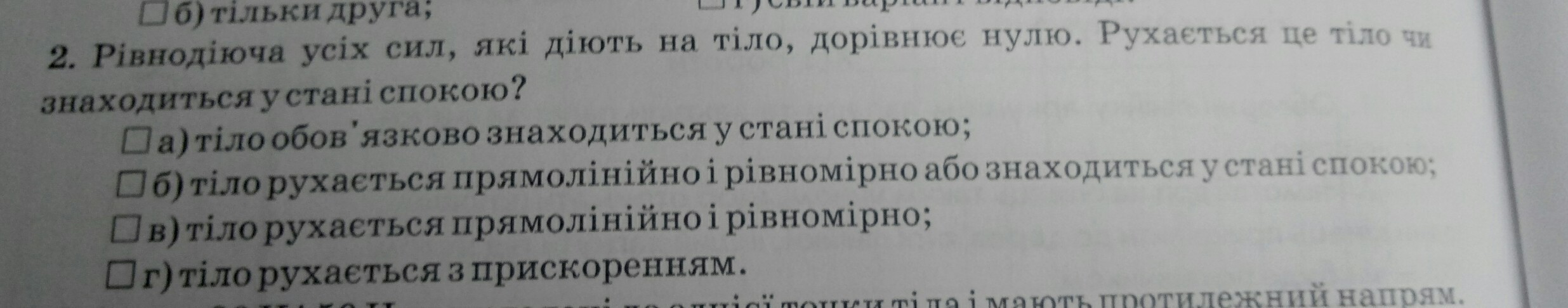 б) тіло буде знаходитись у стані спокою якщо на нього не діють жодні сили або рівнодія цих сил= 0 (1ЗН)