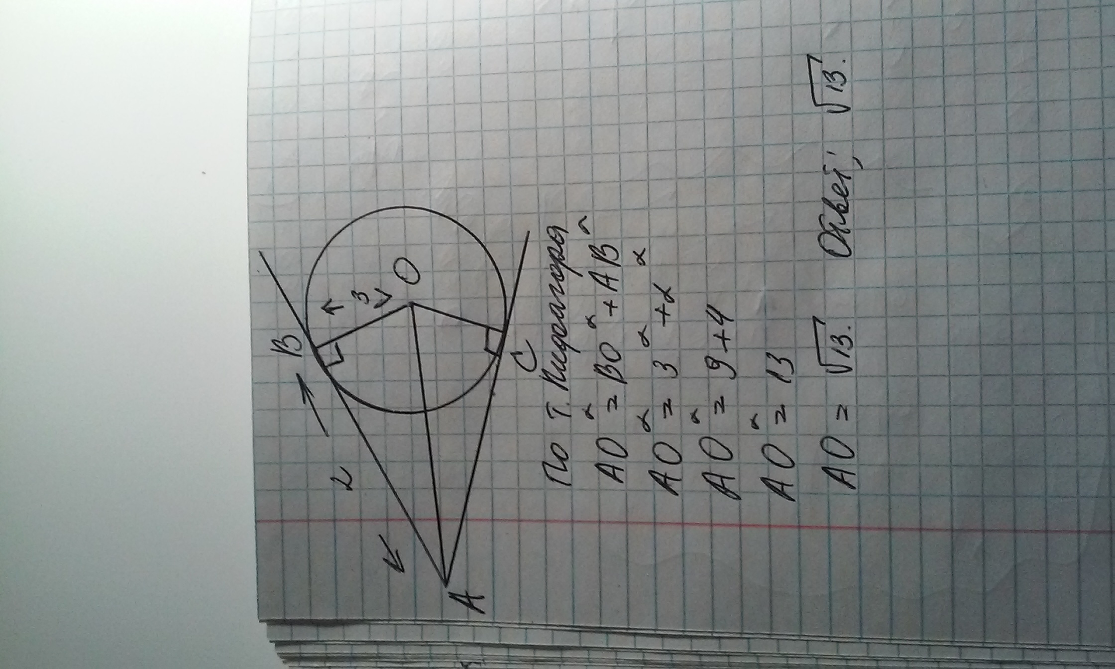 Окружность радиуса 3 см касается сторон угла. Найдите расстояние от вершины угла до центра окружности ,если расстояние от вершины угла до точки косания равно 2 см