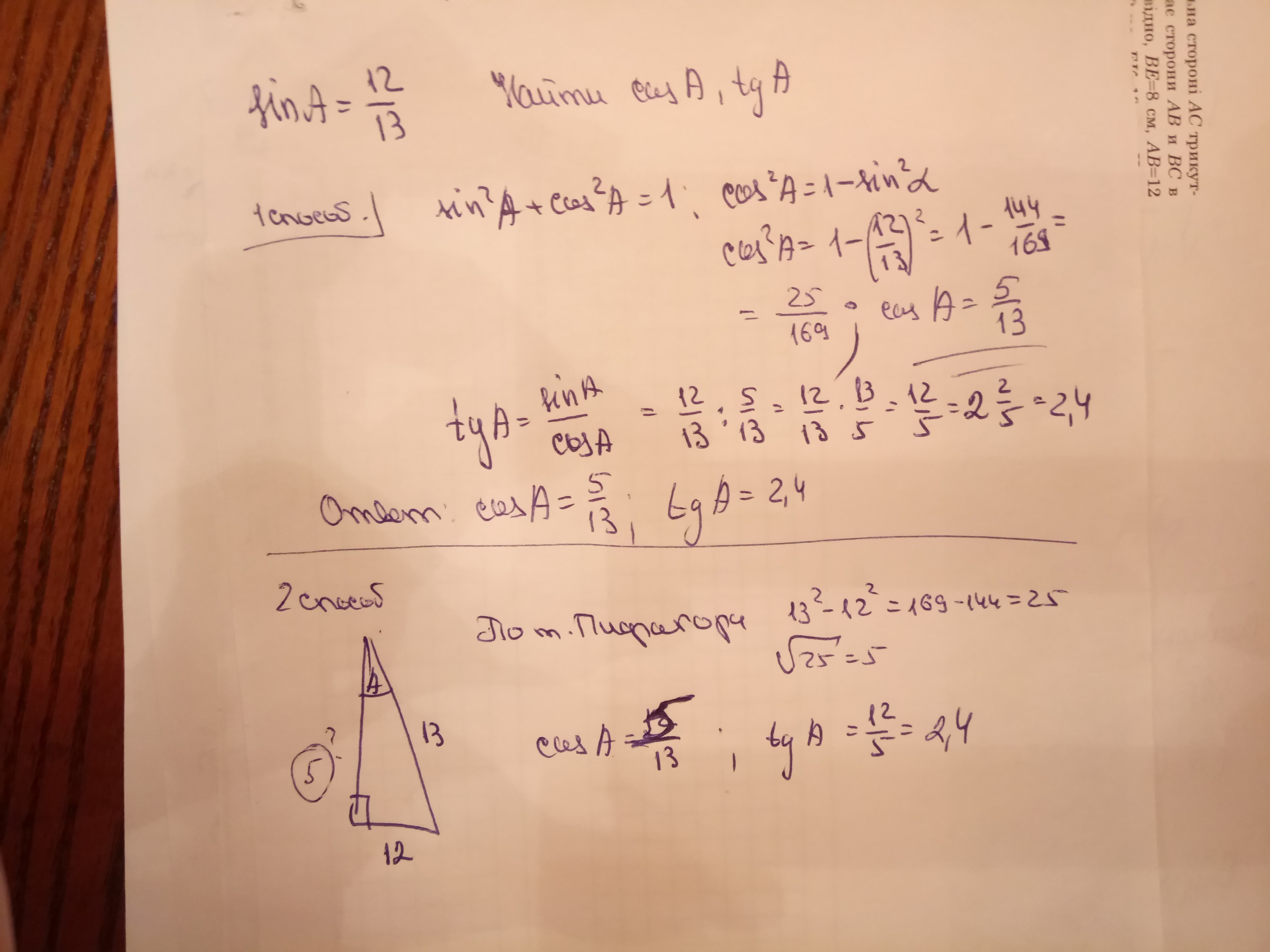 Найдите cosA, tg A, если известно , что sinA=12/13