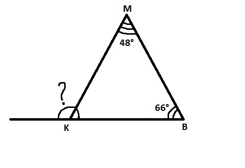В треугольнике КМВ внутренний угол по вершине М равен 48 а внутренний угол при вершине в равен 66 найдите внешний угол при вершине К