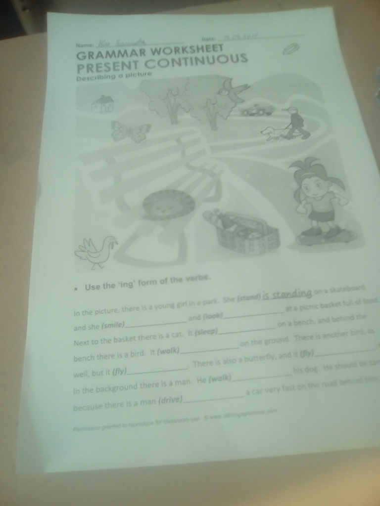 she is smiling, looking, it was sleeping ,it is walking,doesn't flying .it is flying ,he is walking,is driving