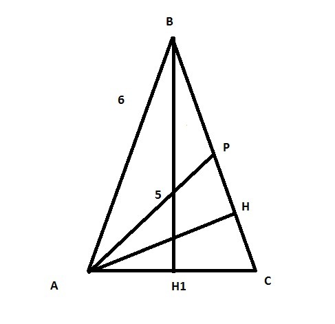 Отрезки AP и AH - соответсвенно медианы и высота равнобедренного треугольника ABC, основанием которого является отрезок AC. Известно, что AB=6 см, AP=5 см. Вычислите косинус угла PAH.