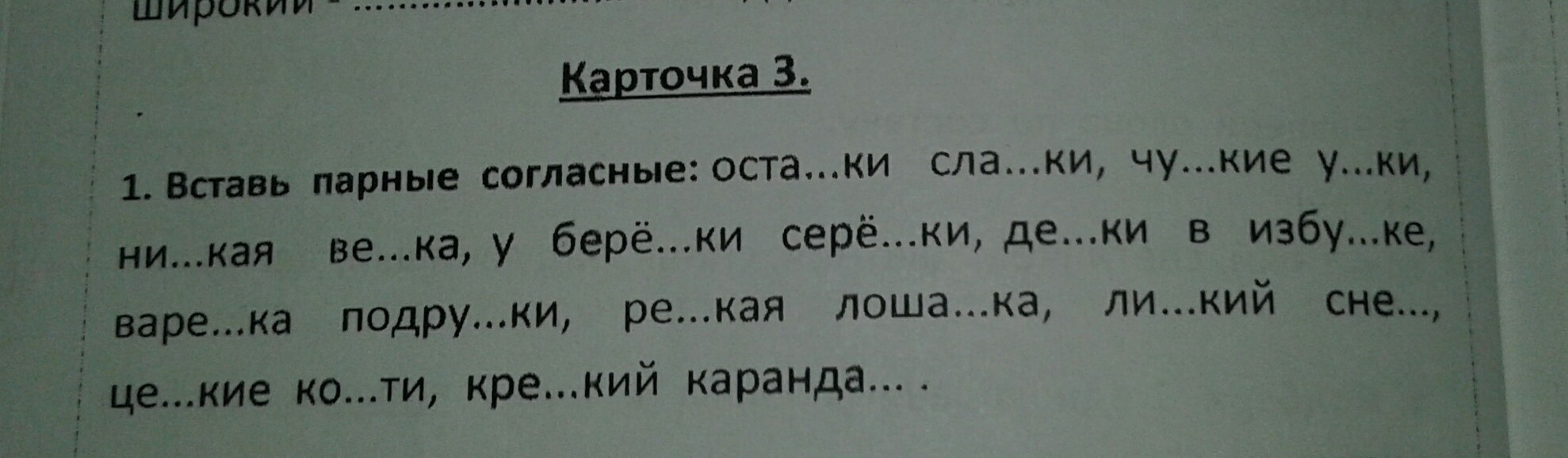 Остатки, чуткие утки,низкая ветка,у берёзки серёжки,детки в избушке,варежка подружки,резкая лошадка,липкий снег,цепкие когти,крепкий карандаш