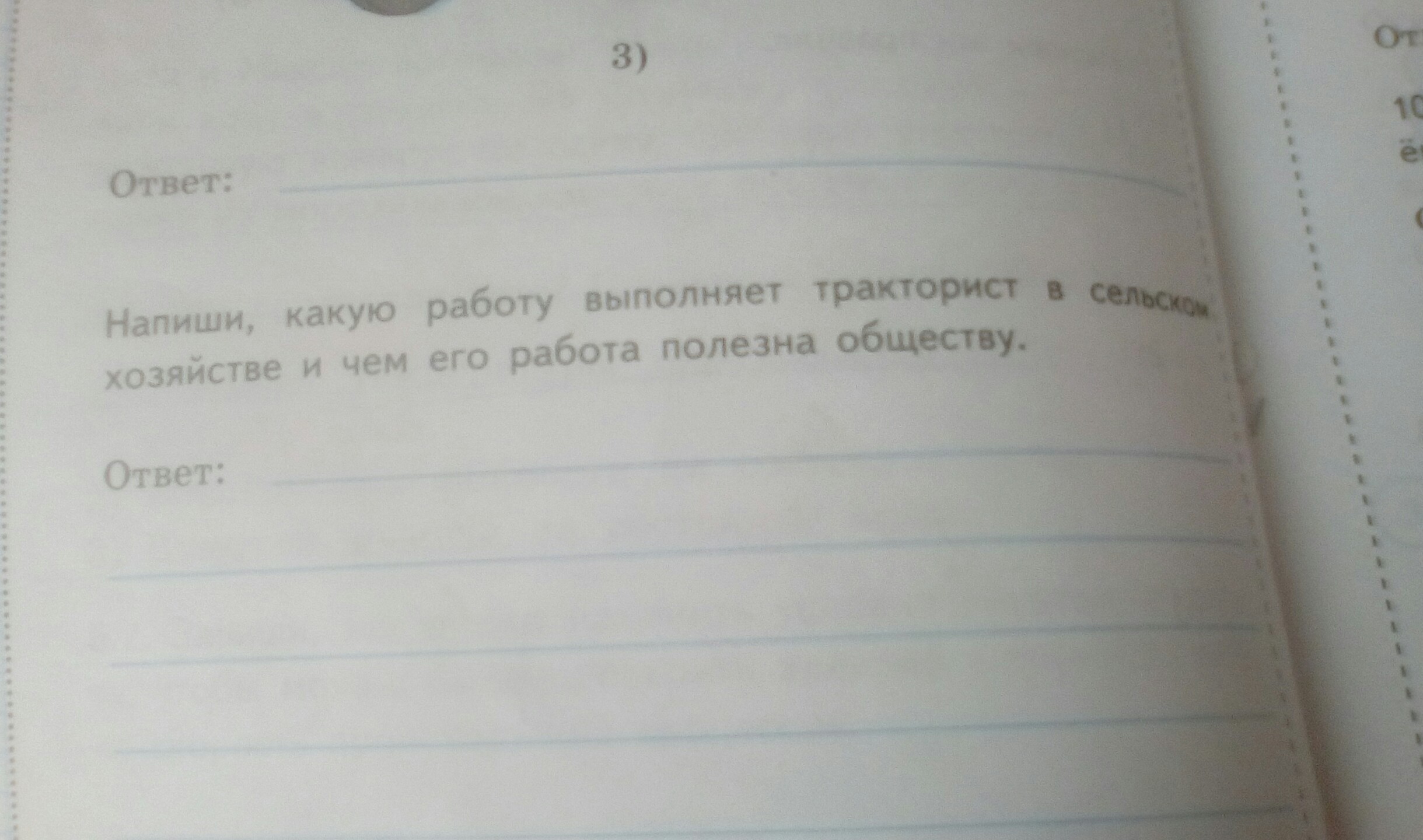 Трактористы например вспахивают землю. Его работа полезна тем, что на этом вспаханном поле потом будут сеять пшеницу, рожь, овощи и др. А из пшеница и ржи сделают хлеб, булку, которую мы покупаем и едим. Если бы трактористы не работали, то урожай был бы очень плохой.
