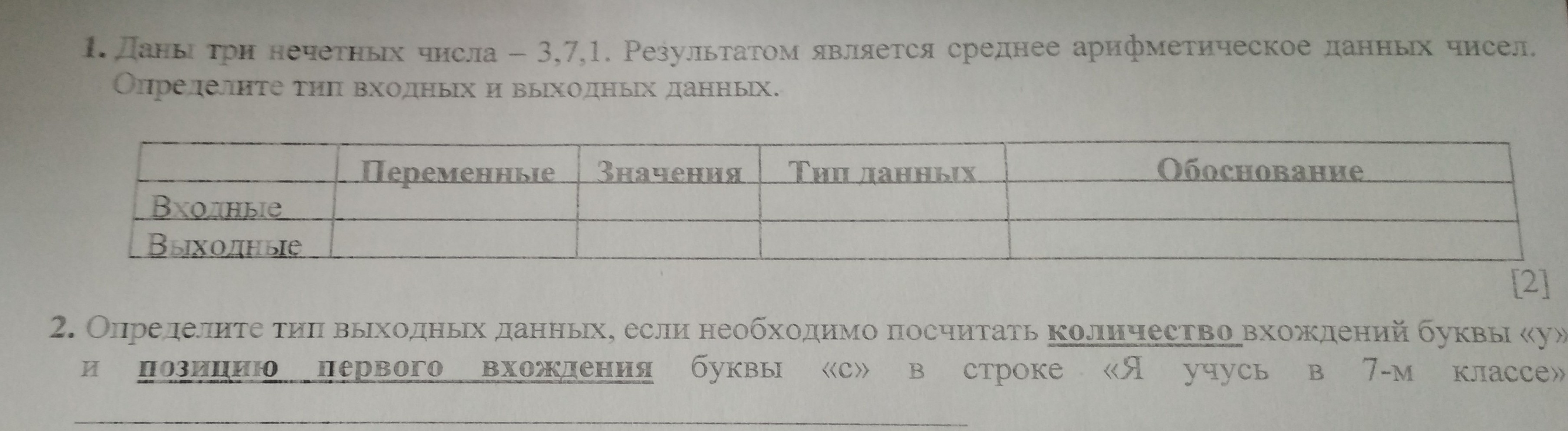 Входные- a,b,c. 3, 7, 1. Целочисленный. Потому что