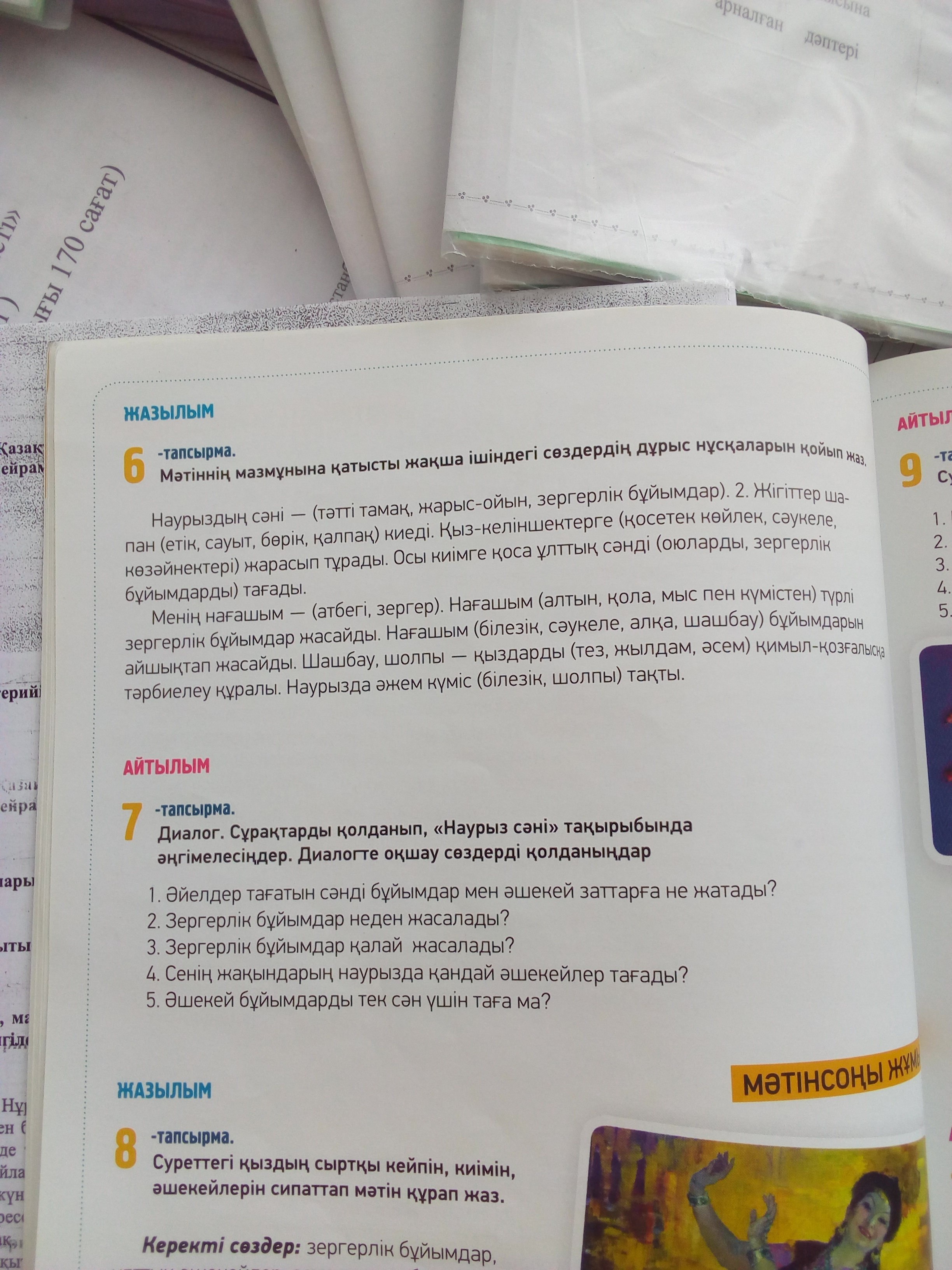 Наурыздың сәні-жарыс ойын.Жігіттер шапан бөрік киеді.Қыз-келіншектерге қосетек көйлек жарасып тұрады. Осы киімге қоса ұлттық сәндік зергерлік бұйымдарды тағады. Менің нағашым зергер. Нағашым мыс пен күмістен түрлі зергерлік бұйымдар жасайды.Нағашым шашбау бұйымдарын айшықтап жасайды. Шашбау,шолпы қыздарды - әсем қимыл-қозғалысқа тәрбиелеу құралы. Наурызда әжем күміс шолпы тақты. Вобщем как-то так.