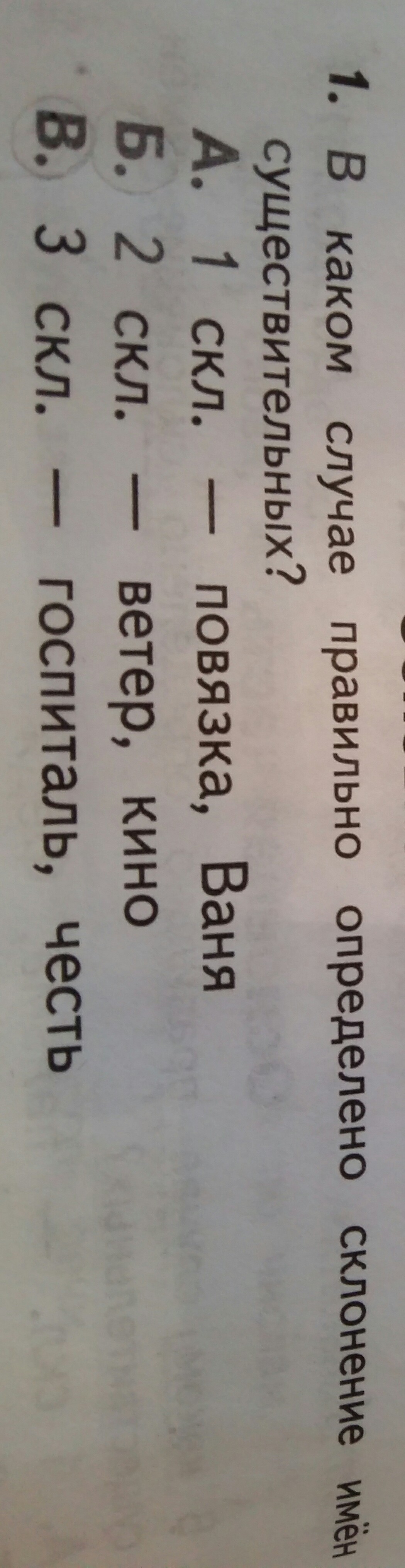 в каком случае правильно определено склонение имён существительных. 1 скл-- повязка,Ваня. 2 скл.--ветер,кино. 3 скл-- госпиталь,честь. ПОМОГИТЕ ПЖ!!