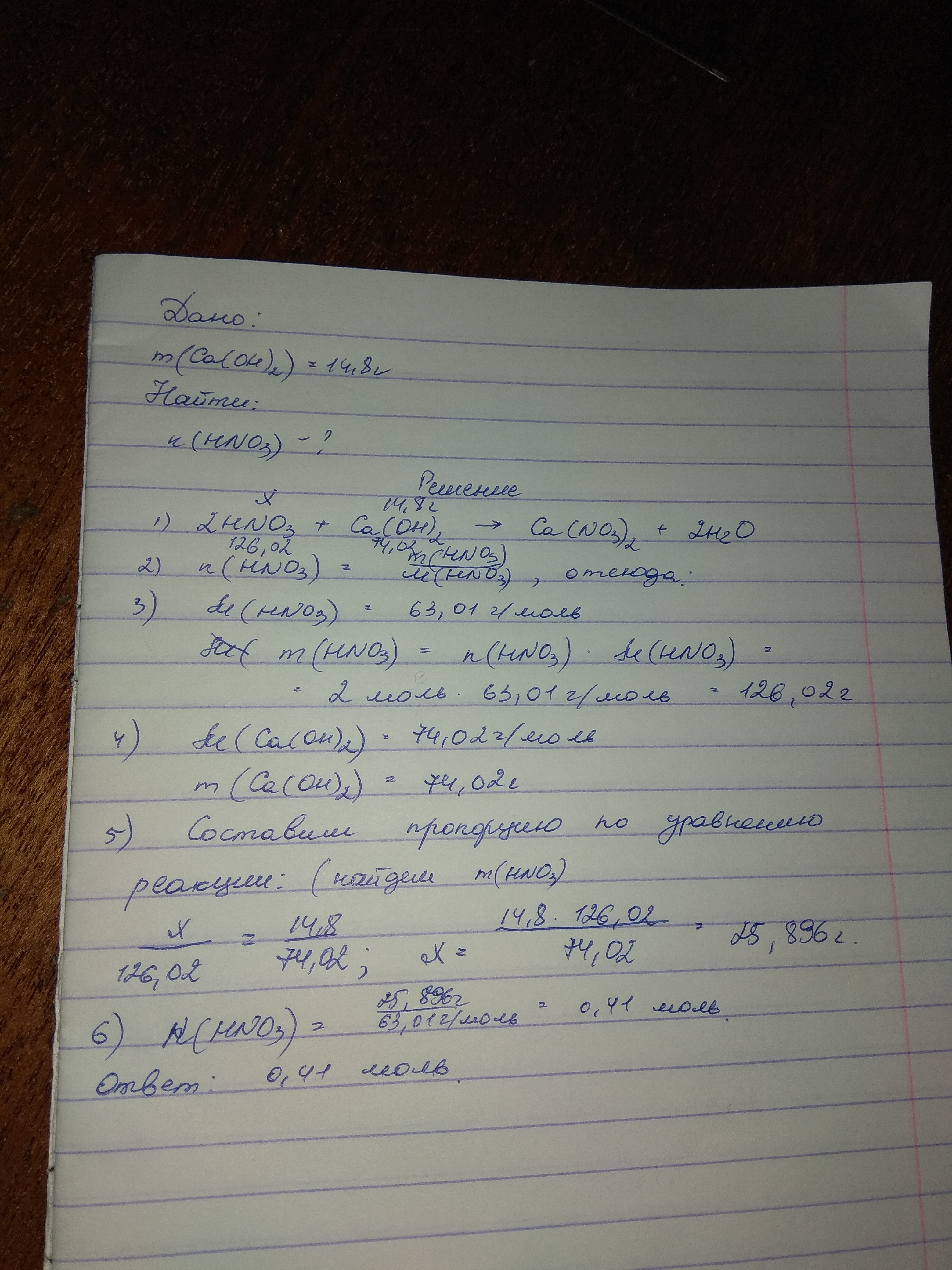 Определить количество вещества азотной кислоты необходимой для реакции с раствором гидроксида кальция массой 14,8г.