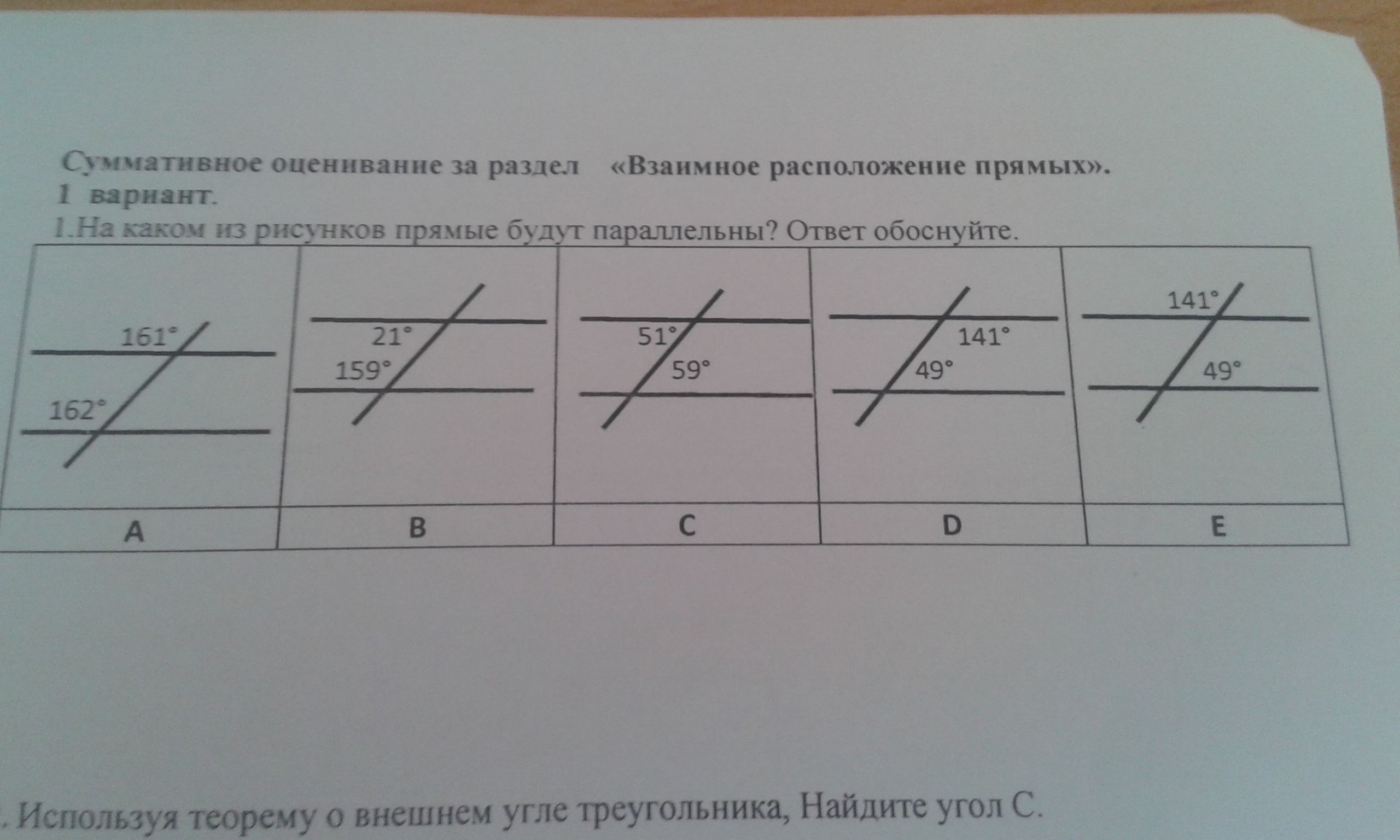 На рисунке B, так как данные углы односторонние, их сумма равна 159°+21°=180°, значит, прямые параллельны.