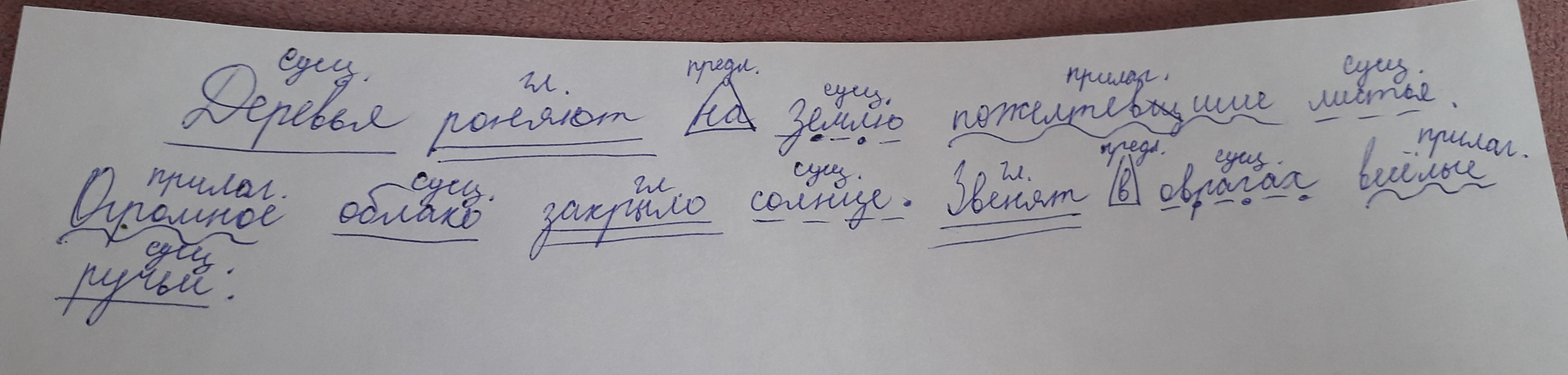 Деревья роняют на землю пожелтевшие листья .Огромное облфко закрыло солнце.Звенят в оврагах весёлые ручьи. подчеркни в предложении главные и второстепенные члены и обозначь над каждым словом часть речи