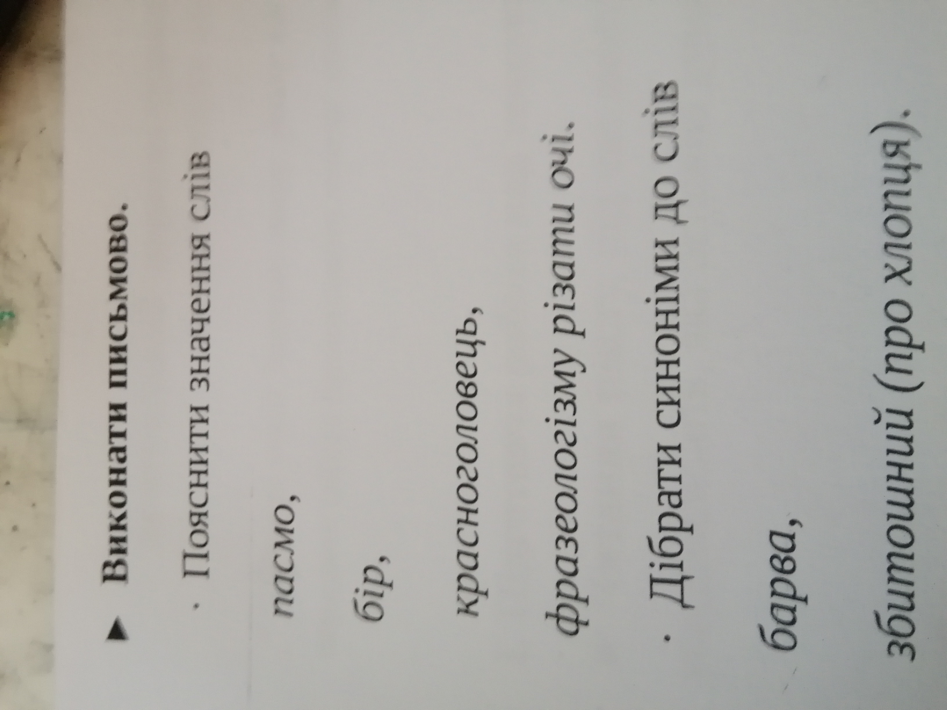 Пасмо - пучок волосся ; бір -типи лісорослинних умов, що характеризуються дуже бідними ґрунтами і оліготрофною рослинністю ;красноголовець -Їстівний гриб із червоною або жовтогарячою шапкою ; Фразеологізм "різати очі" Якщо не помиляюся означає робити щось довго, з напруженими очіма ; барва синонім (колір) ;збитошний (пустотливий)