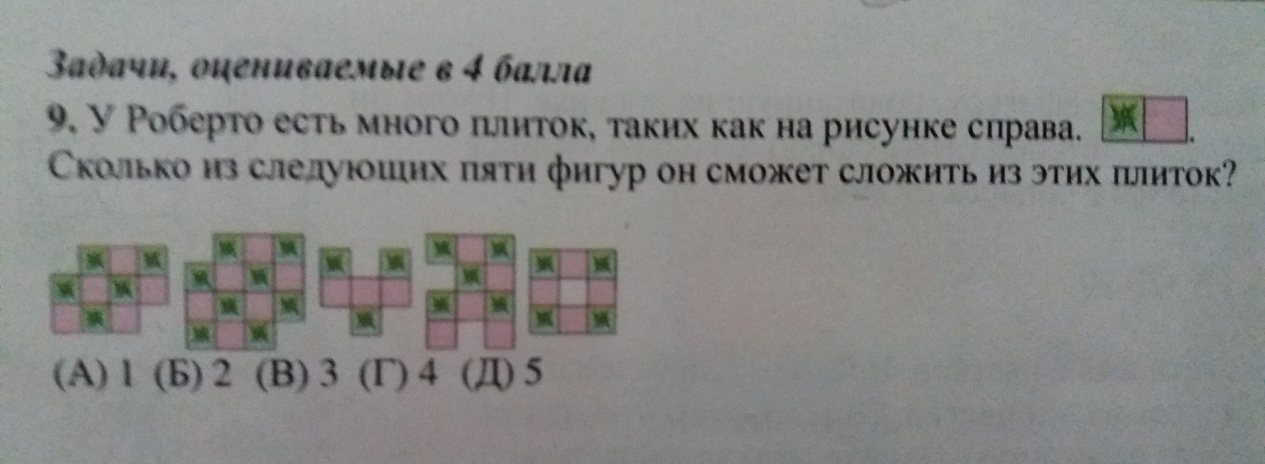 (Г)4 смотри, тебе дано какие плитки, теперь считай сколько их в предмете, то есть равно ли количество розовых и зеленых квадратиков