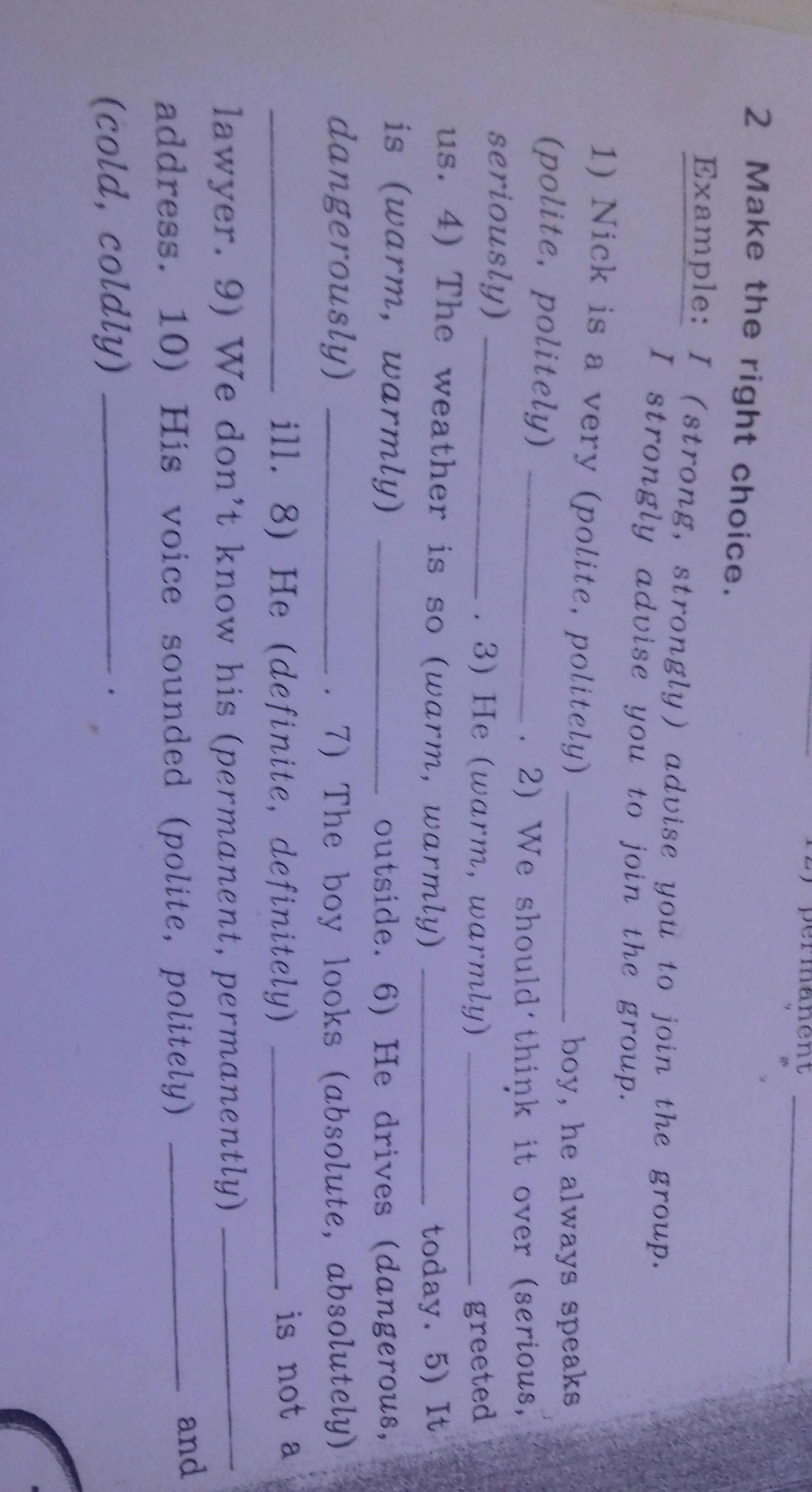 1.polite...politely. 2.seriously. 3.warmly.4.warm. 5.warm. 6.dangerously. 7.absolutely. 8.definitely. 9.permanent. 10.polite...cold