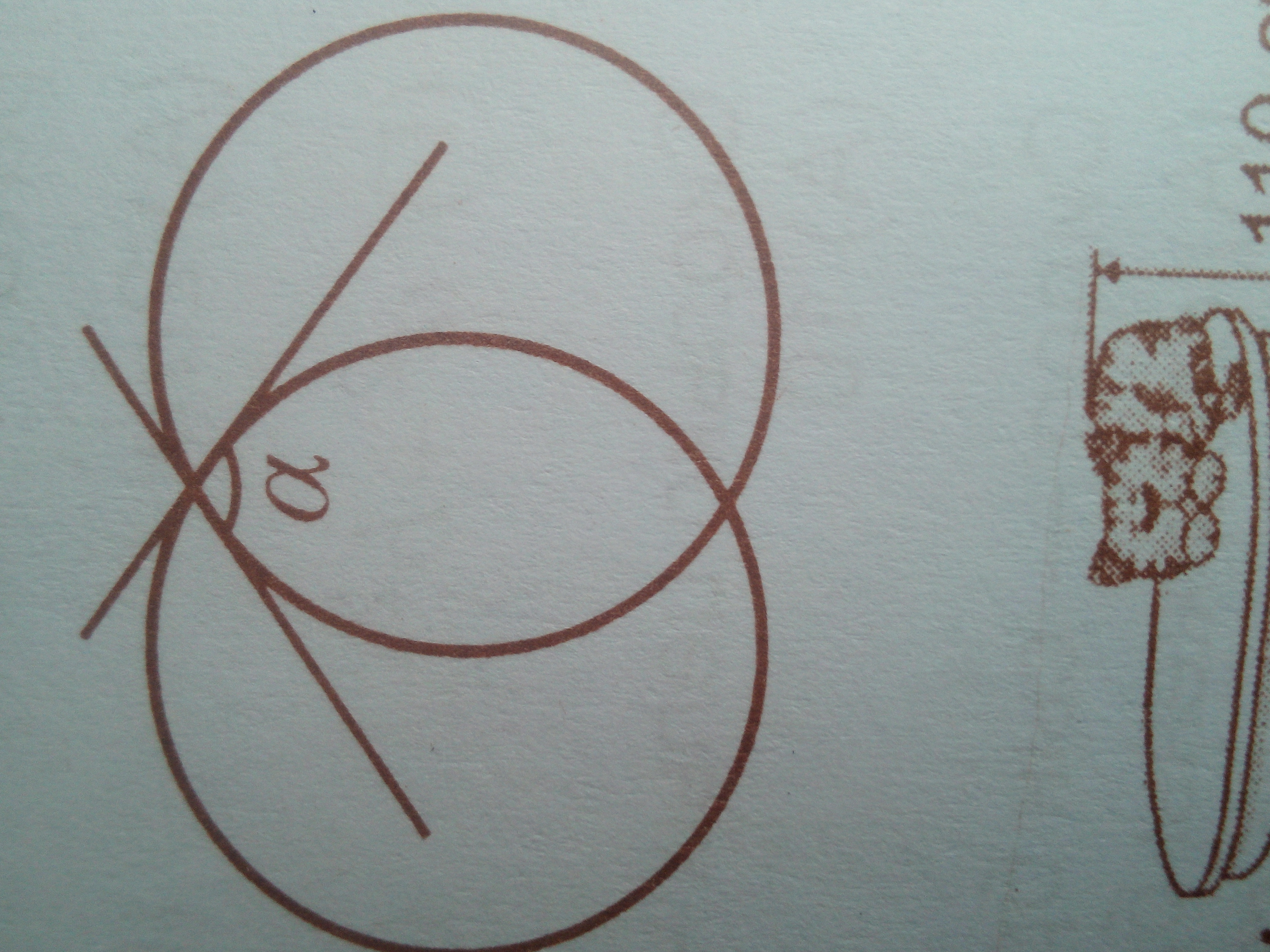 Окружности на рисунке имеют одинаковый радиус и проходят через центры друг друга.В точке пересечения к ним провели касательные.Чему равен угол a?