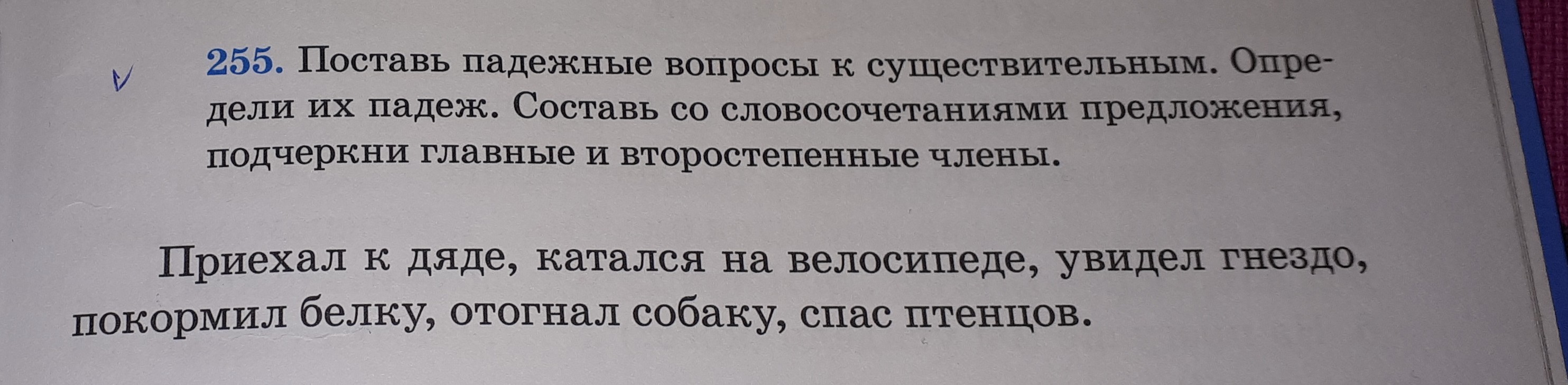 Приехал ( к кому? Д.п. ) к дяде, катался ( на чём? П.п.) на велосипеде, увидел ( что? В.п. ) гнездо, покормил ( кого? В.п. ) белку, отогнал ( кого? В.п. ) собаку, спас ( кого? Р.п. )