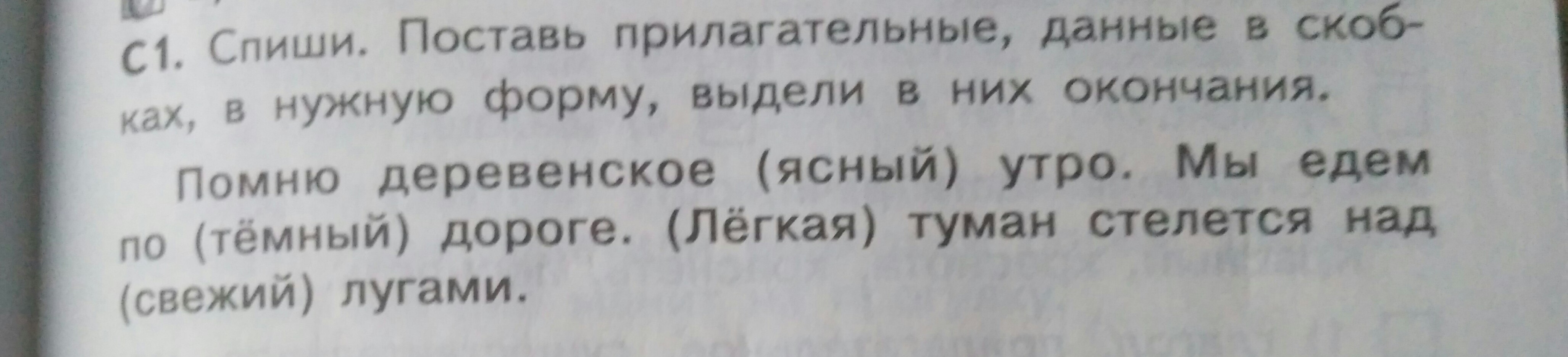 Помню деревенское ясное утро. Мы едем по тёмной дороге. Лёгкий туман стелется над свежими лугами. Окончания: ое, ой, ий, ими.