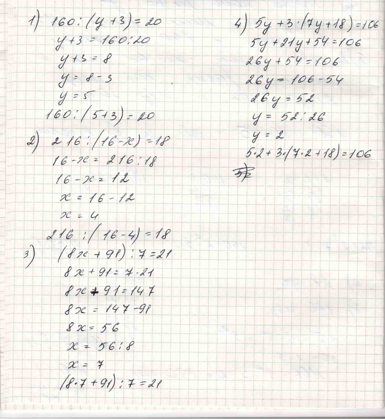 Помогите решить уравнение:1) 160:(у+3)=20; 2) 216:(16-х)=18; 3) (8х+91):7=21; 4) 5у+3(7у+18)=106;