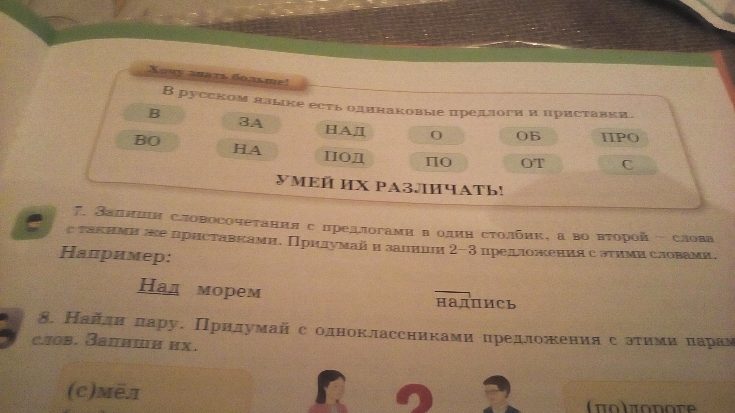 Запиши словосочетание с предлогами в один столбик, а во второй-слова с такими же приставками. Придумай и запиши 2-3 предложения с этими словами