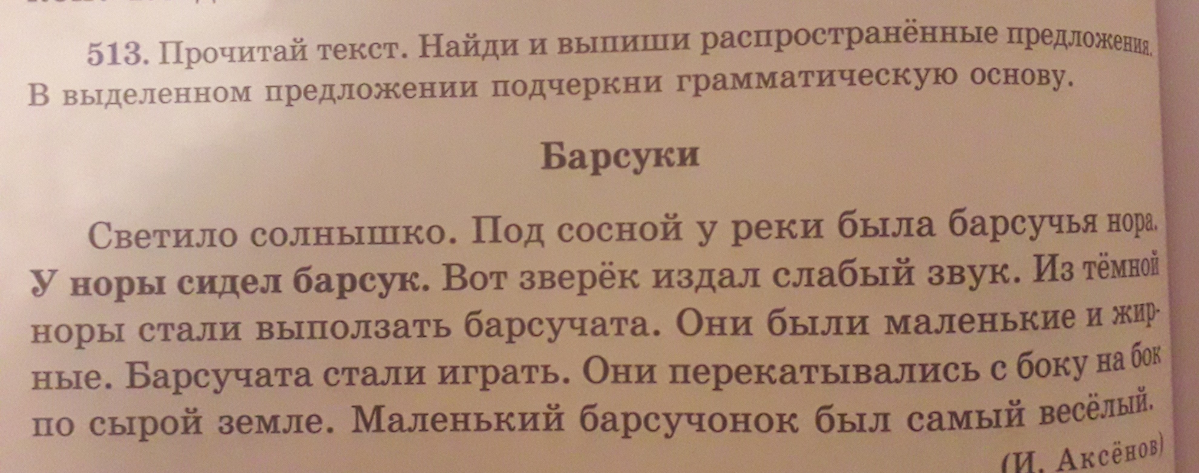 Распрастранёные предложение: Светило солнышко;у норы сидел барсук;они были маленькие и жирные; барсучата стали играть;маленький барсучонок был самый весёлый.
