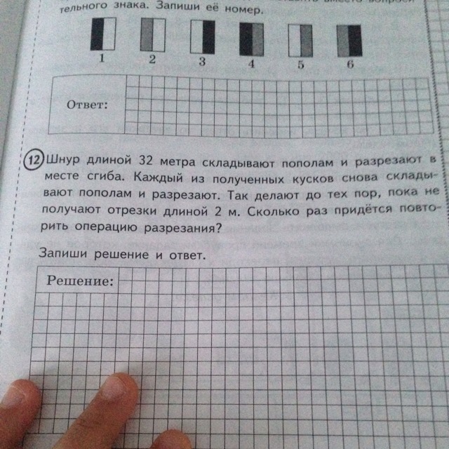Шнур длиной 32 м складывают пополам и разрезают в месте сгиба. Каждый из полученных кусков снова складывают пополам и разрезают. Так делаю до тех пор пока не получают отрезке длиной 2 м. Сколько раз придётся повторить операцию разрезания?